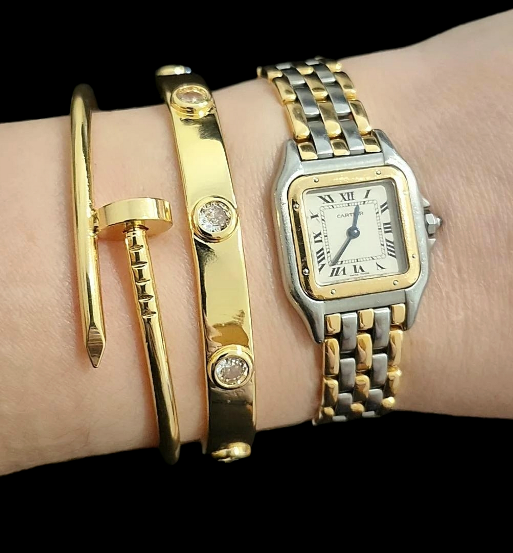Ideal para usar sola como acento principal o en layering junto a un reloj o pulseras más finas.