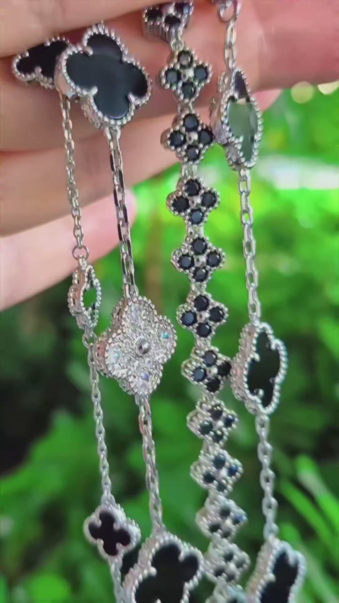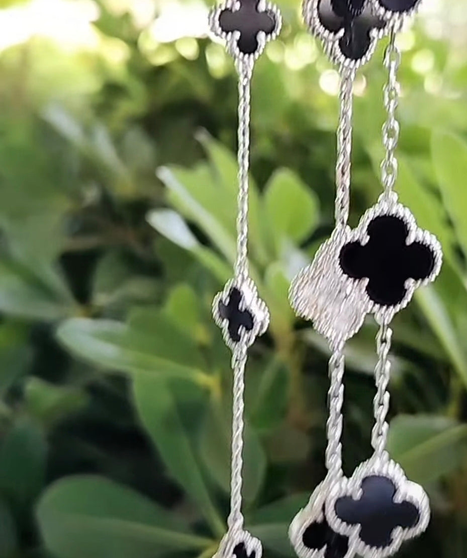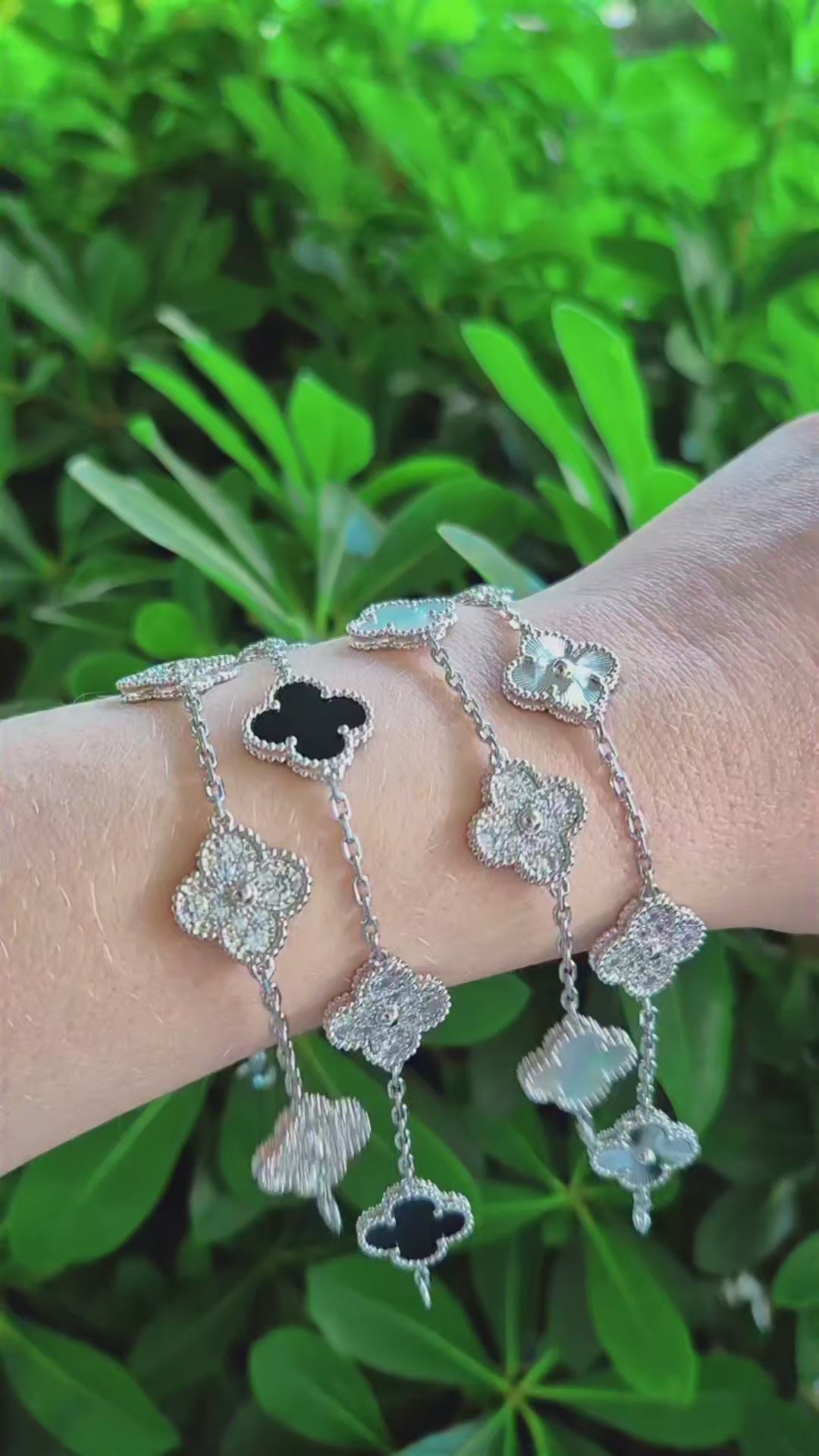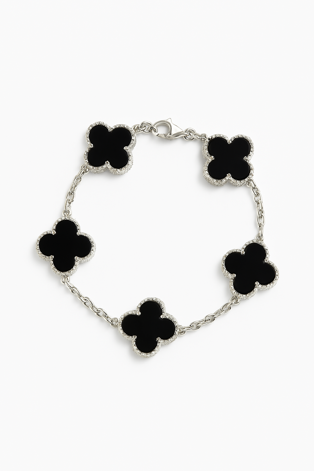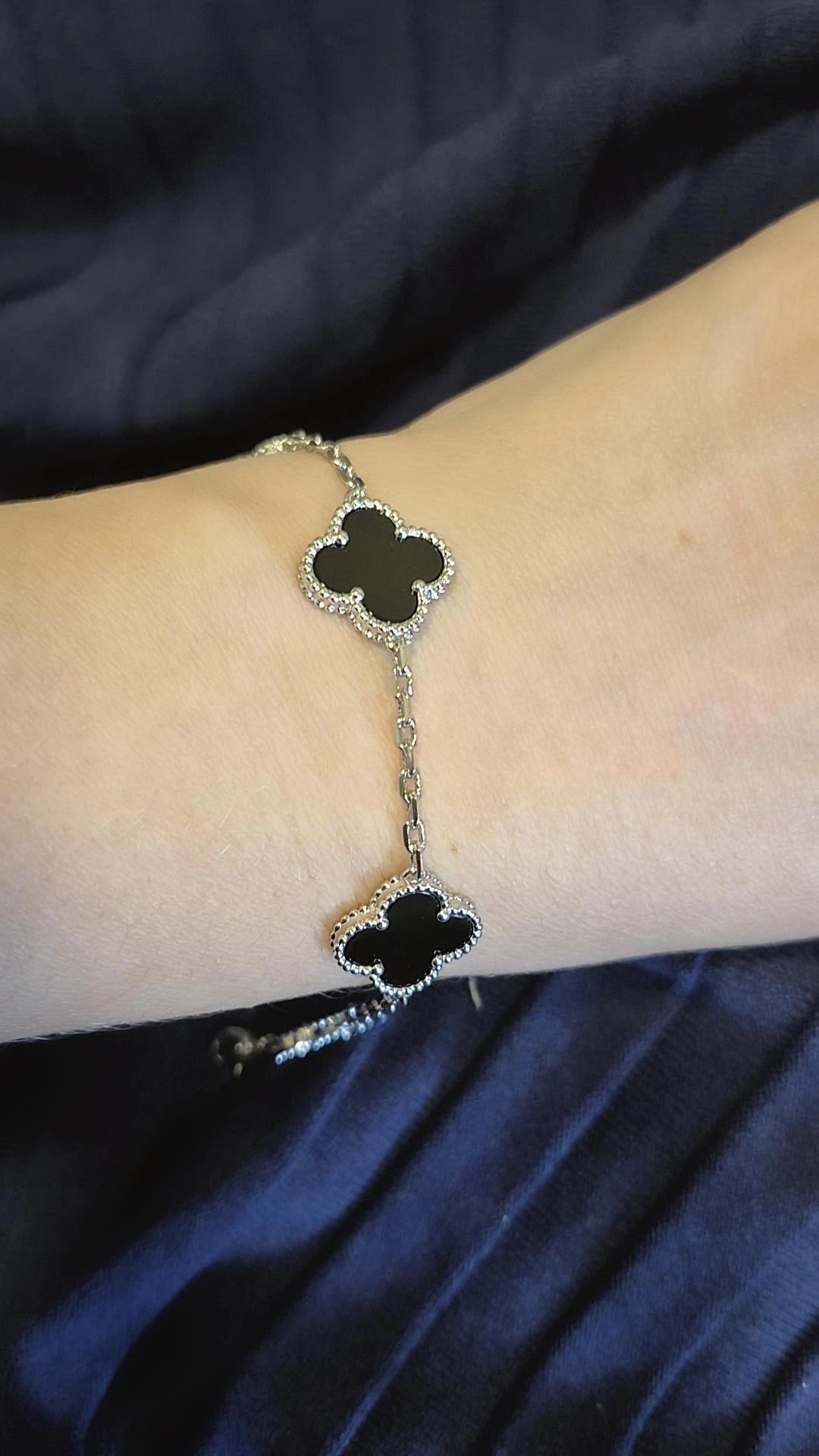 Esta pulsera de plata 925 con baño de oro tiene un elegante diseño tiene 5 flores de onix en cada lado, con 3 capas de baño de platino que le dan un brillo excepcional.