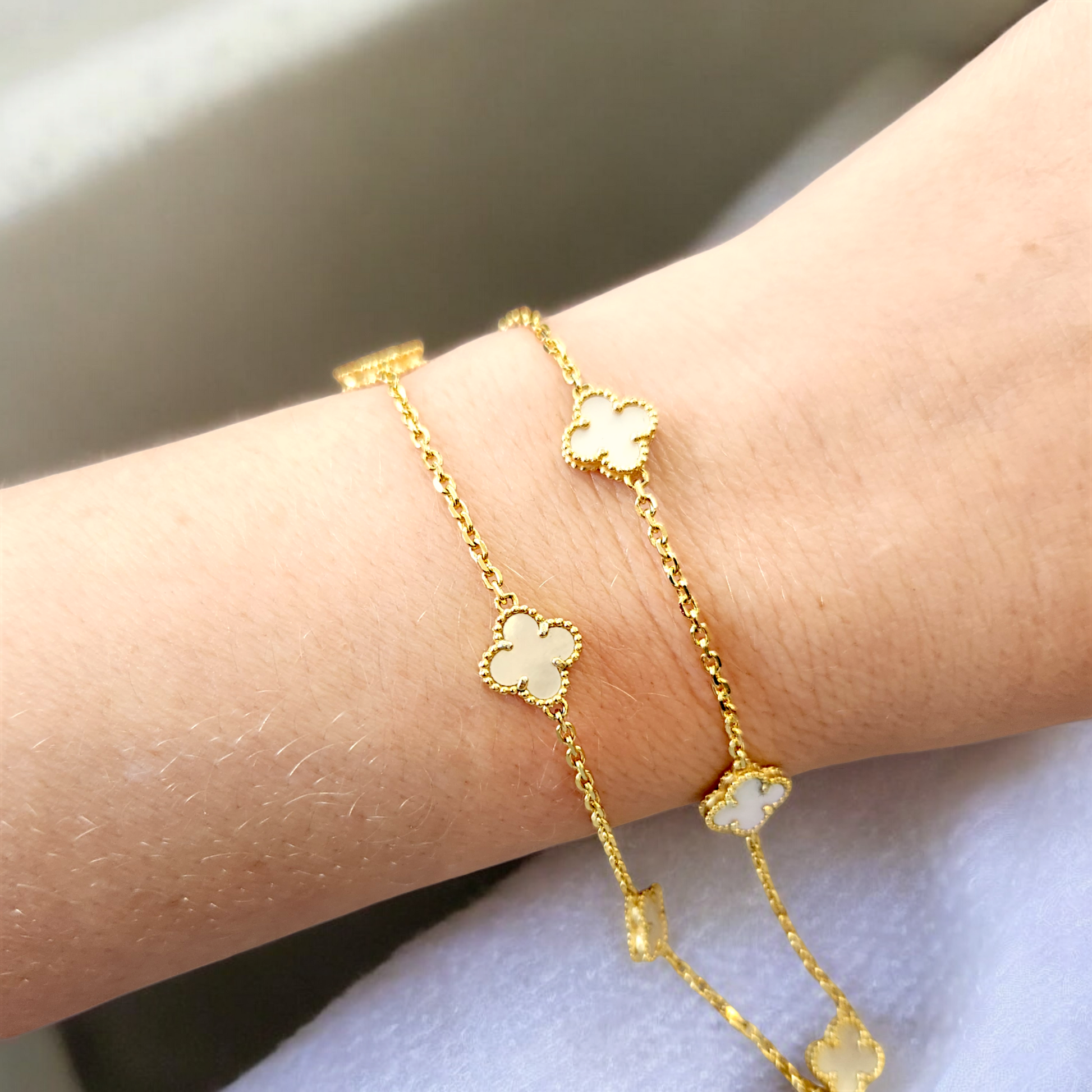 Disfruta de la elegancia y el brillo de la naturaleza con nuestra Pulsera Sweet Clover Nácar.