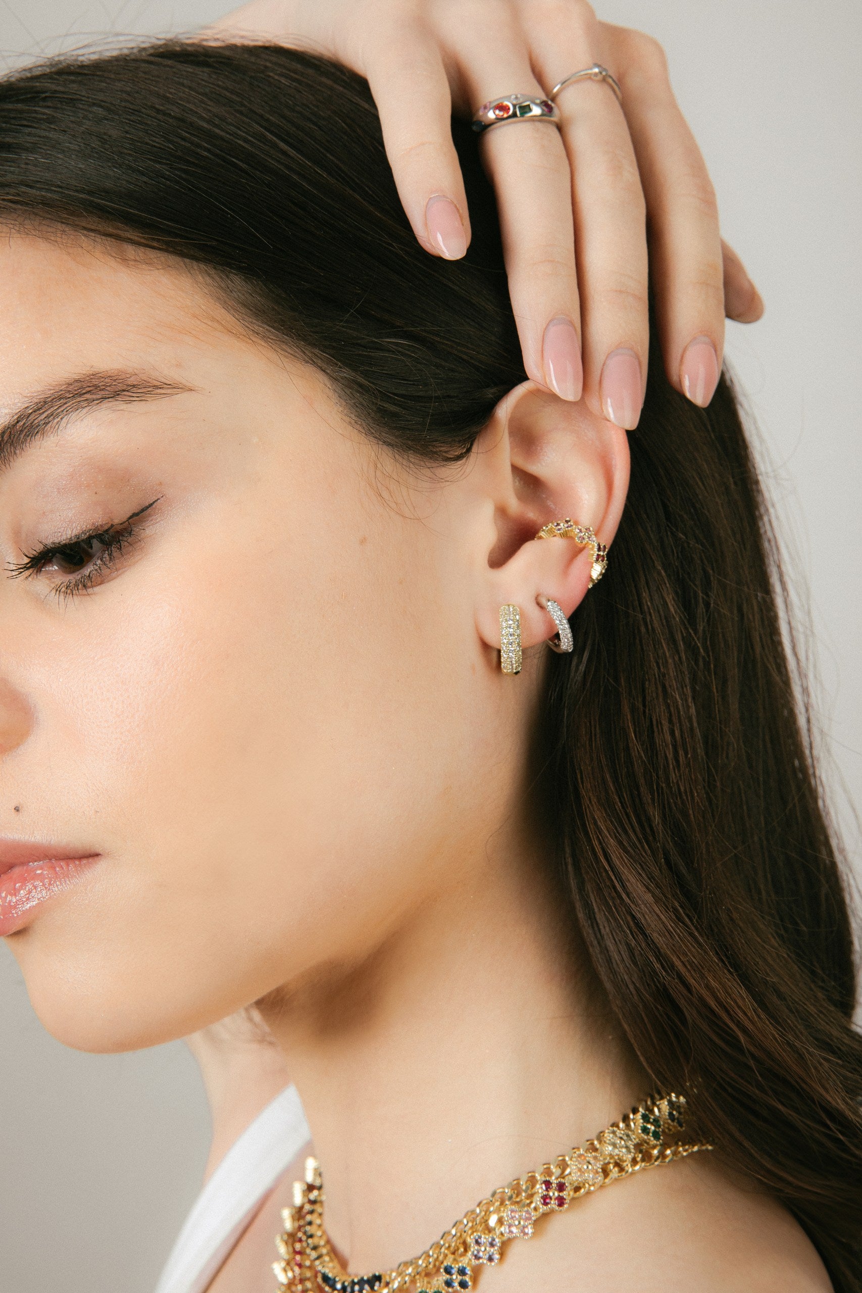 Cada aro está finamente decorado con una serie de circones brillantes, cuidadosamente incrustados para capturar la luz desde cualquier ángulo.