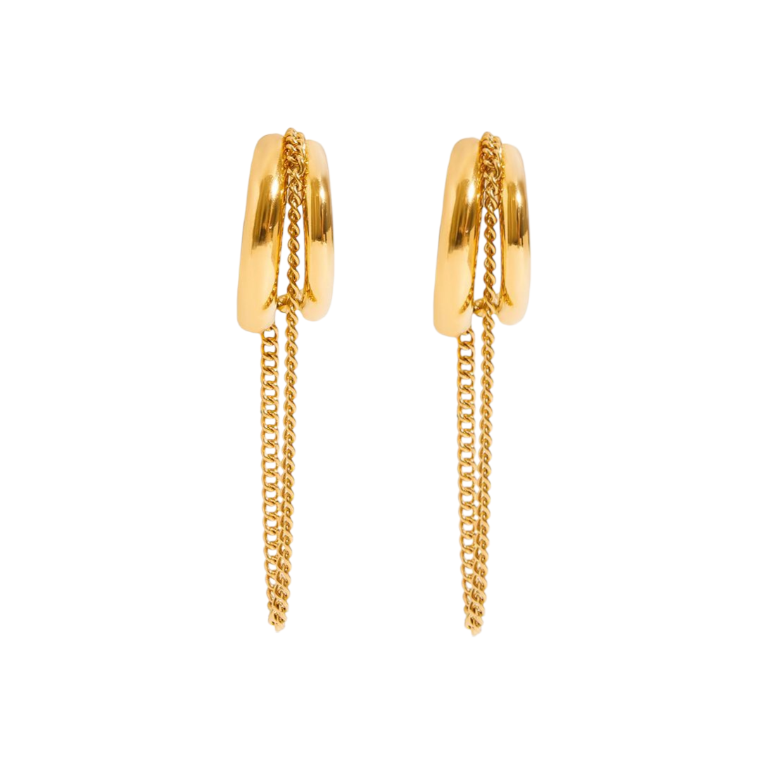 Estas argollas doradas con cadena destacan por su diseño minimalista y moderno, ideal para mujeres que buscan un accesorio versátil y con estilo.