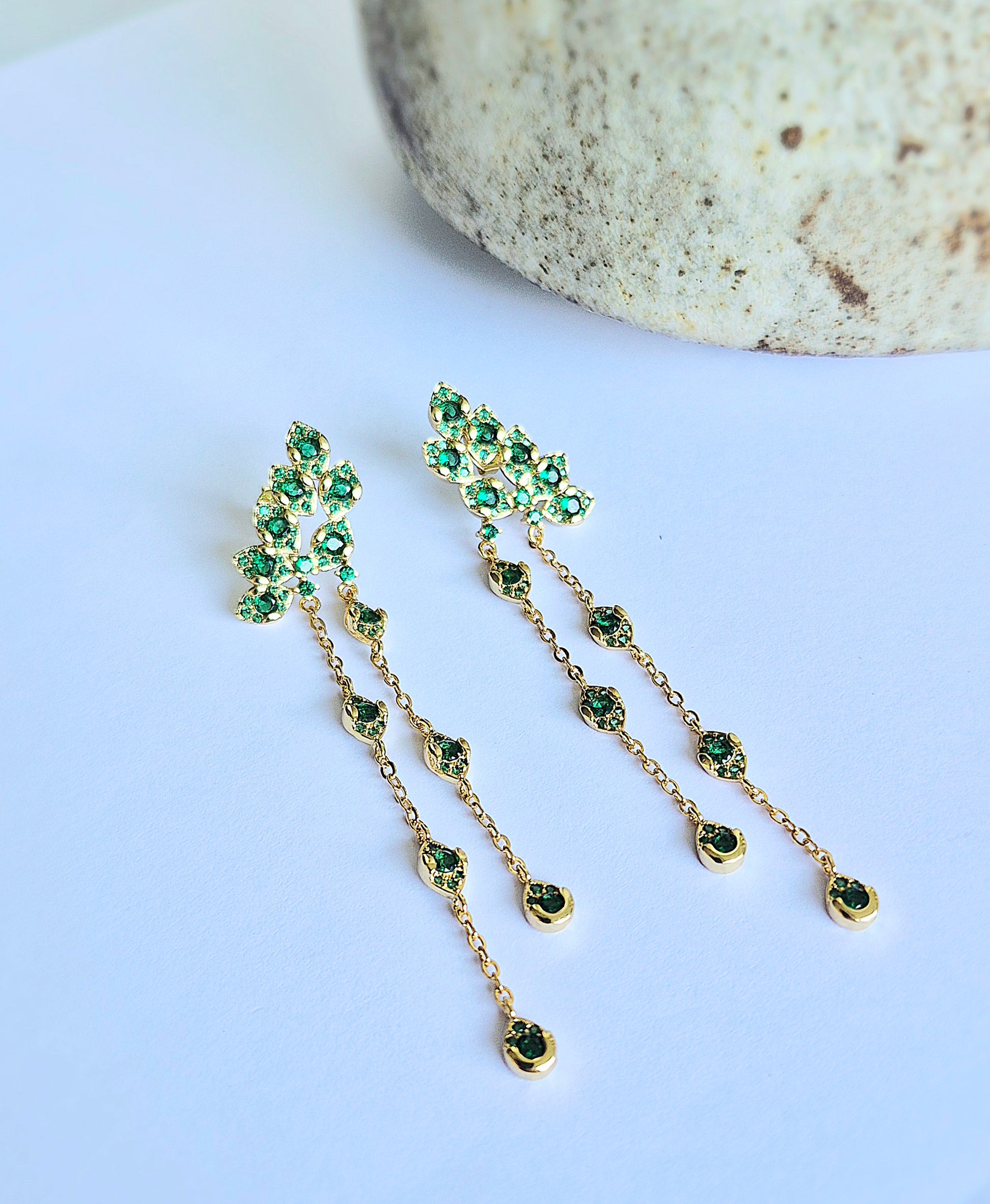 Aros Largos Hojas Shine Verde Plata 925 – Baño de Oro
