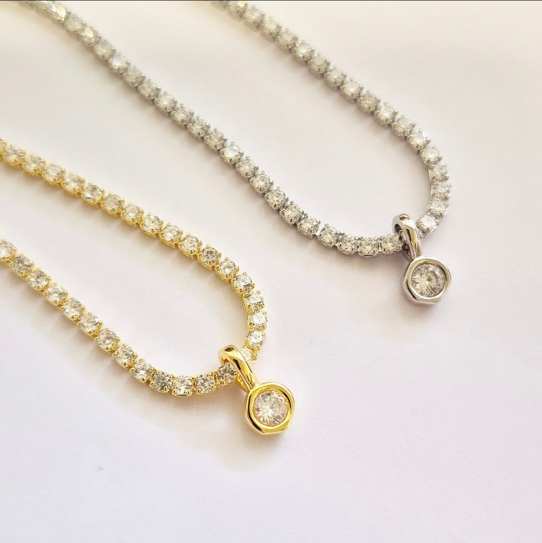Cadena pieza diseñada para quienes buscan brillo, elegancia y versatilidad en un solo accesorio. Nuestra Cadena Tennis Ajustable incorpora un dije redondo engastado que aporta un toque sofisticado y moderno, ideal para elevar cualquier look. 35+3cm