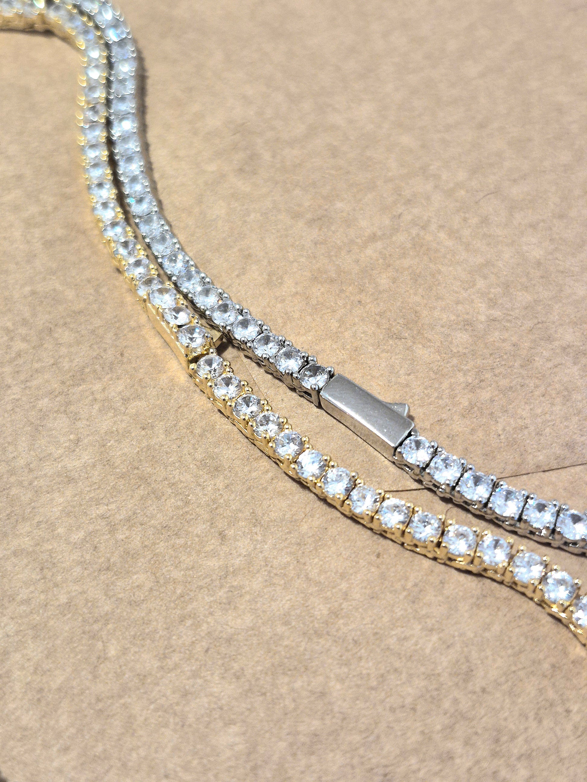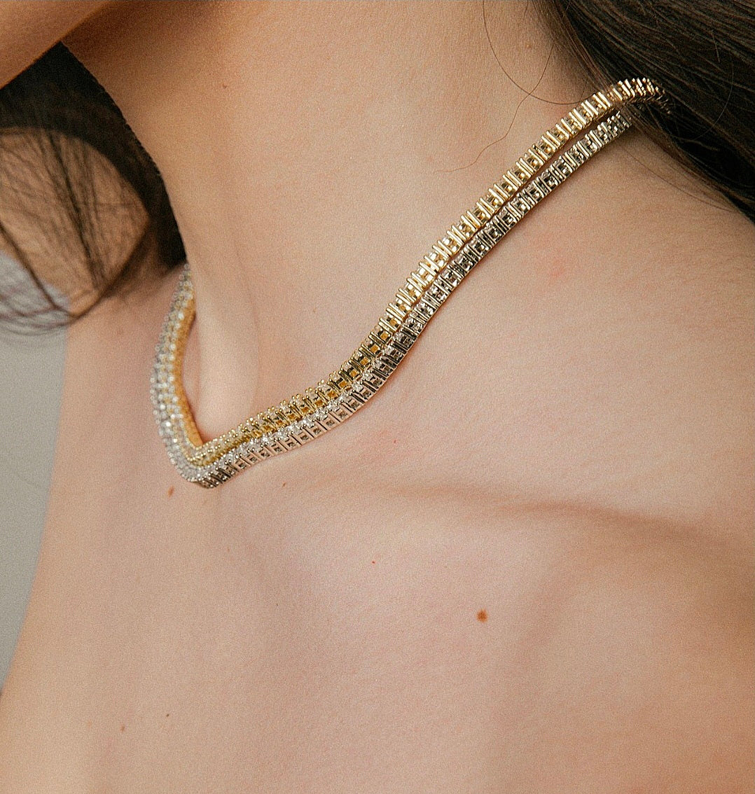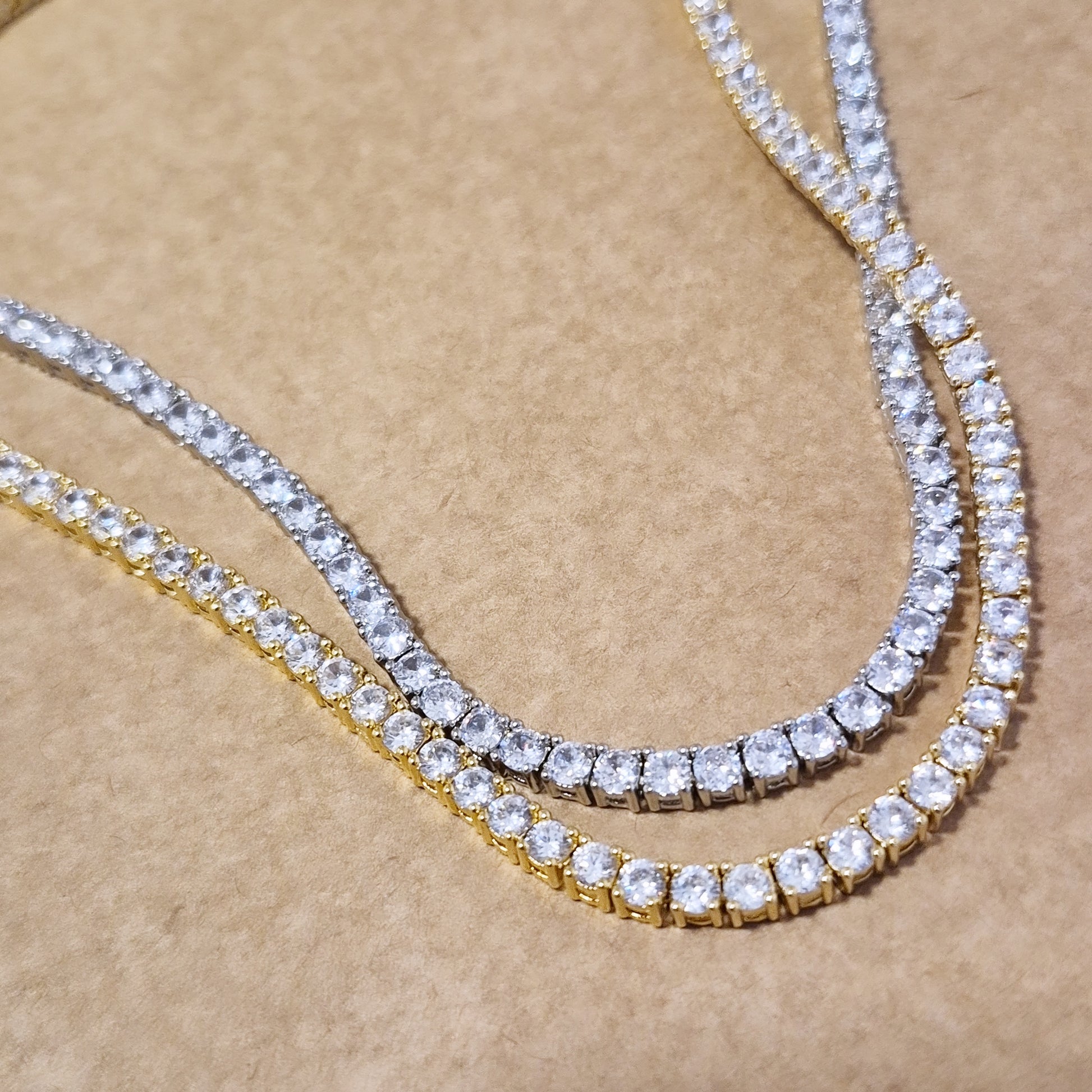 Collar de tennis con circones de 3mm y acabado en tres capas de oro blanco o amarillo de 18k.