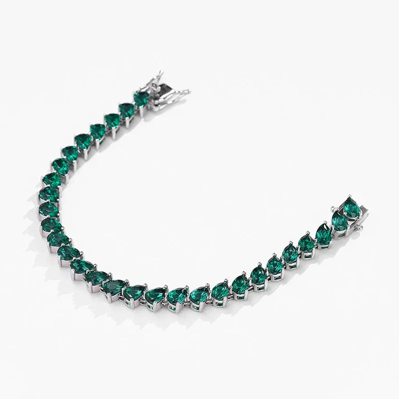 Eleva tu estilo con esta pulsera de lujo con esmeraldas creadas en laboratorio (4x6mm, corte gota), inspiradas en la intensidad de las esmeraldas de Zambia. Cada piedra ha sido engarzada a mano en plata esterlina 925 con un acabado impecable, logrando una joya sofisticada y atemporal.